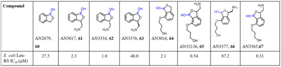 In recent years, the rise in the prevalence of Gram-negative antimicrobial resistance has become a concerning factor. Gram-negative bacteria cause approximately 70% of infections in intensive care units [91]. A growing number of bacterial isolates are responsible for resistance to currently available antibiotics. Therefore, considerable effort has been directed to thedevelopment of new classes of antibiotics by the modification of existing drugs to overcome the resistance mechanism of bacteria. As described above, inhibition of aminoacyl-tRNA synthetase and leucyl-tRNA synthetase (LeuRS) in fungi has been demonstrated through an oxaborole tRNA-trapping (OBORT) mechanism [51]. In this regard, the Plattner group described a new series of boron-based antibiotics [53] that were tested for their antibacterial activity. AN3365 (67) was foundto beactive against E. coli LeuRS, with an IC50 value of 0.31 μM. The lead compound (67) was also found to be activeagainst Gram-negative bacteria, including Enterobacteriaceae-bearing NDM-1, KPC carbapenemases, and P. aeruginosa. Moreover, compound 67 has a good murine pharmacokinetics profile and was found to be efficacious against E. coli and P. aeruginosa in murine thigh infection models (Scheme 18).