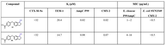 Previous findings suggest that structural variation plays a crucial role in SAR studies, as well as in the overall activity of the drug candidate. As we have discussed in this review, the heteroaryls tethered at the sixth position of benzoxaborole moiety are effective. In this regard, Xia et al. synthesized a library of novel benzoxaborole β-lactamase inhibitors. The synthesized compounds were screened against enzyme TEM-1 and AmpC from Enterobacter cloacae P99 and showed promising broad-spectrum inhibitory activity. The 6-aryloxy benzoxaboroles (68 and 69) showed potent inhibition of AmpC P99 and CMY-2, with Ki values in the lower nanomolar range (Scheme 19) [55]. SAR studies demonstrated variation of different ether linkers using different substitution patterns in the C6 position of benzoxaboroles. The authors also described the synthesis of heteroaryl analogues to investigate the effect of lipophilicity on antibacterial activity. Compound 68 restored antibacterial activity of ceftazidime against Enterobacter cloacae P99-expressing AmpC, a class C β-lactamase enzyme.