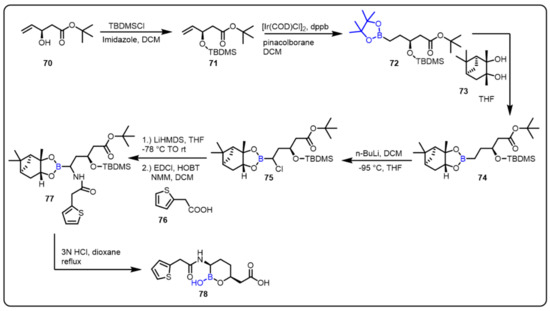 The Dudley group described a new series of serine β-lactamase inhibitors bearing a cyclic boronic acid pharmacophore to find a potent inhibitor of serine carbapenemase enzymes. All the synthesized compounds were tested in biochemical and whole-cell assays. Among all tested compounds, compound 78 was found to be the most potent inhibitor of serine carbapenemases, mainly the Klebsiella pneumoniae carbapenemase (KPC), without inhibition of mammalian serine proteases. Moreover, compound 78 showed similar pharmacokinetics in the rat model to β-lactam antibiotics, including carbapenems. Notably, in vitro and in vivo studies revealed that RPX7009 (78) has broad-spectrum inhibitory activity [92]. Combined with a carbapenem, compound 78 was a promising drug candidate for the treatment of multidrug-resistant, Gram-negative bacteria (Scheme 20).