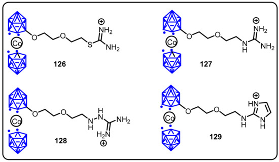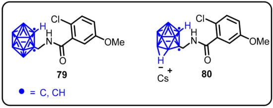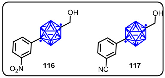 Carboranes are boron, carbon, and hydrogen-based pseudoaromatic polyhedral clusters. Theywere introduced into biological systems as pharmacores in 1961 by Soloway et al. [93,94,95,96]. Carboranes are used as a rich source of boron for Boron Neutron Capture Therapy (BNCT) [97]. Carboranes have been valuable bioisosteres for phenyl groups and adamantane because their size and lipophilicity are comparable, but their remarkable structures allow for novel drug development frontiers to be explored. Another important feature of carboranes inmedicinal chemistry is their ability to convert the neutral, lipophilic closocluster into the anionic, hydrophilic nido species in a single synthetic step. Carborane functionalizations via various synthetic methodologieshave been of significant interest in recent years, which can be attributed to their remarkable stability towards moisture and biological degradation, as well astheir low toxicity. More notably, they facilitate transport across the blood–brain barrier (BBB), which is a significant challenge for the development of drugs for the central nervous system (CNS).