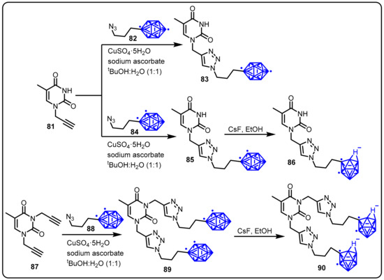 1,2,3-triazoles have a broad range of applications in the field of synthetic, medicinal, and material chemistry. Sharpless [98] and Meldal [99] presented a milestone for the region-selective synthesis of 1,4-disubstituted triazole by the reaction of azides with alkynes in the presence of copper salt. This kind of reaction is known as copper-catalyzed azide–alkyne cycloaddition (CuAAC) or click reaction. Olejniczak and colleagues developed a series of novel thymine derivatives, such as lipophilic, electron-neutral 1,2-dicarba-closo-dodecaborane; 1,12-dicarba-closo-dodecaborane;and hydrophilic 7,8-dicarba-nido-undecaborate anions, by the reaction of N1-propargylthymine or N1,N3-bispropargylthymine with 1-(3-azidopropyl)-1,2-dicarbacloso-dodecaborane through a copper-catalyzed 1,3-dipolar cycloaddition reaction [31]. The synthesized compounds were evaluated in vitro against Mycobacterium tuberculosis thymidylate kinase (TMPKmt) and as inhibitors of mycobacteria growth in culture against pathogenic Mycobacterium tuberculosis (M. tuberculosis) and saprophytic Mycobacterium smegmatis (M. smegmatis) strains. Among all tested compounds, compound 90 was found to have the most potent TMPKmt inhibitor activity, exhibiting a Ki value of 1.5 mM (Scheme 22). In addition, compounds 85 and 89 inhibited M. smegmatis proliferation at a concentration of 100 mg/mL, with MIC values of 0.25 mM and 0.15 mM, respectively.