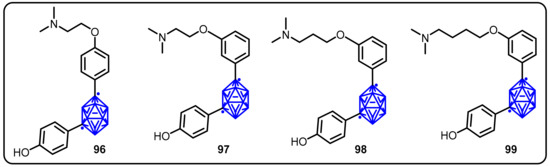 - Ohta, K.; Ogawa, T.; Kaise, A.; Endo, Y. Synthesis and biological evaluation of novel m-carborane-containing estrogen receptor partial agonists as SERM candidates. Bioorg. Med. Chem. Lett. 2015, 25, 3213–3216. [Google Scholar] [CrossRef]