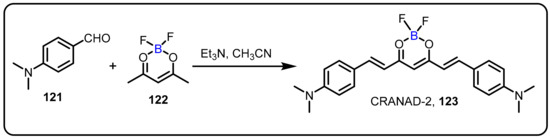 - Ran, C.; Xu, X.; Raymond, S.B.; Ferrara, B.J.; Neal, K.; Bacskai, B.J.; Medarova, Z.; Moore, A. Design, synthesis, and testing of difluoroboron-derivatized curcumins as near-infrared probes for in vivo detection of amyloid-beta deposits. J. Am. Chem. Soc. 2009, 131, 15257–15261. [Google Scholar] [CrossRef] [PubMed]