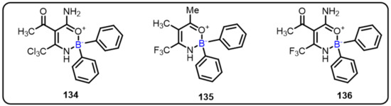 - Kanichar, D.; Roppiyakuda, L.; Kosmowska, E.; Faust, M.A.; Tran, K.P.; Chow, F.; Buglo, E.; Groziak, M.P.; Sarina, E.A.; Olmstead, M.M.; et al. Synthesis, characterization, and antibacterial activity of structurally complex 2-acylated 2,3,1-benzodiazaborines and related compounds. Chem. Biodivers. 2014, 11, 1381–1397. [Google Scholar] [CrossRef] [PubMed]