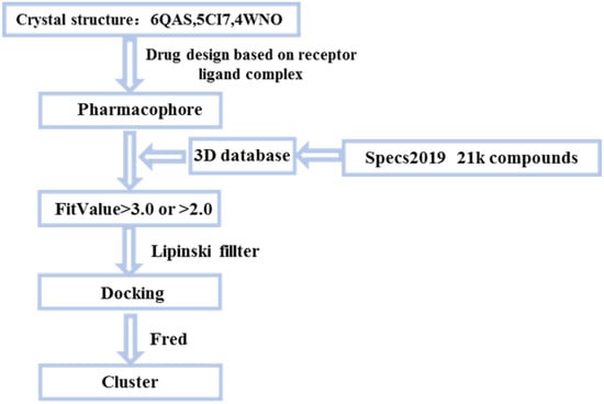 The X-ray structure of UKL1 in complex with ligands (PDB code: 6QAS,5CI7, 4WNO) was downloaded from the Protein Data Bank (accessed on 15 December 2020 at https://www.rcsb.org). Then, the identical protein chains and the co-crystallized water molecules were deleted, and the cognate ligand was stripped from the crystal structure and saved for future use. The “Clean Protein” and “Prepare Protein” tools of Discovery Studio were used to solve potential problems in the protein structure, such as nonstandard names, incomplete residues, nonstandard atom orders, alternate conformations, as well as incorrect connectivity and bond orders, modification of all hydrogen atoms and terminal residues, and generate the protonation state at pH 7.0.