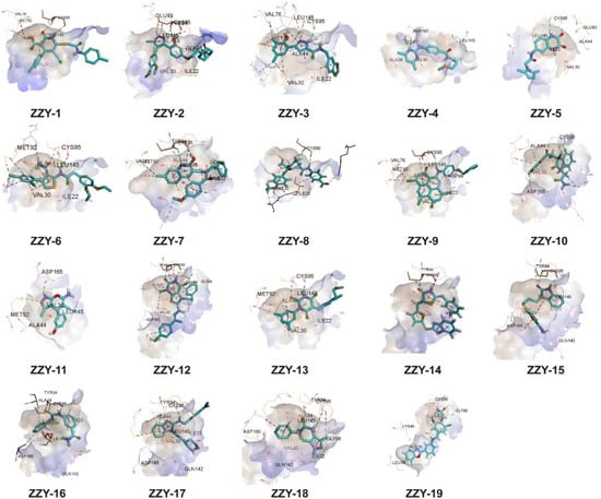 We then selected the top 19 compounds and firstly examined the anti-proliferative ability of HepG2 and HCCLM3 cells. Since the compound ZZY-12 is insoluble, we did not choose it in subsequent experiments. We found that the ZZY-19 displayed well cell killing effects (Figure 5A,B), which was better than XST-14. We then examined the binding abilities of these 18 candidate ULK1 inhibitors using surface plasmon resonance (SPR) analysis (Table 3). Among these small molecules, ZZY-19 (KD = 5.466 × 10−10 M) displayed a high binding affinity for ULK1 (Figure 5C). Taken together, ZZY-19 were potential candidate compounds that targeted ULK1.