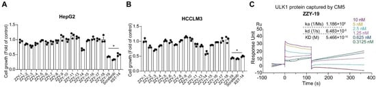 Structure-based virtual screening for the discovery and validation of ULK1 inhibitors (A,B) Effects of the ULK1 inhibitors on the proliferation of HepG2 and HCCLM3 cells. The inhibition rates were calculated by comparing with the control group; (C) The kinetic interactions of the ULK1 protein and ZZY-19 were determined by SPR analyses. The indicated concentrations of ZZY-19 were passed over immobilized ULK1 on CM5 sensor chips. The affinity constants were evaluated using BIA evaluation software. * p < 0.05.