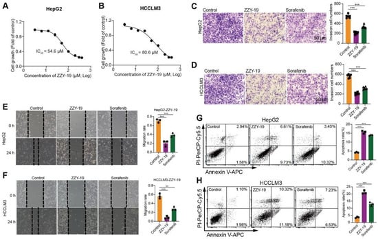 To further determine the effect of ZZY-19 on HCC cells, we detected the proliferation, invasion, migration, and apoptosis of HepG2 and HCCLM3 cells treated with ZZY-19. We found that ZZY-19 remarkably inhibits the proliferation of HepG2 and HCCLM3 cells. The IC50 of ZZY-19 was 54.6 μM in HepG2 and 80.6 μM in HCCLM3 cells (Figure 6A,B). We then performed invasion assays and wound healing assays to evaluate the effects of ZZY-19 on the invasion and migration of HCC cells. Flow cytometry analysis with Annexin V-PI staining was performed to evaluate the percentage of apoptotic cells in HepG2 and HCCLM3 cells treated with ZZY-19. We found that ZZY-19 could decrease the invasion (Figure 6C,D) and migration (Figure 6E,F) of HepG2 and HCCLM3 cells and significantly increased the percentage of apoptotic cells (Figure 6G,H). These results showed that ZZY-19 possessed promising anti-HCC activities.