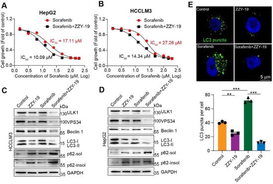 We then investigated the effects of the synergistic effects of ZZY-19 and sorafenib on the proliferation activities of HCC cells. We found that the ZZY-19 remarkably sensitized HepG2 and HCCLM3 cells to sorafenib’s cell killing effects (Figure 7A,B). Western blotting was used to detect the effects of ZZY-19 with or without sorafenib on autophagy related proteins. We found that ZZY-19 treatment decreased LC3-II, Beclin 1, VPS34 and ULK1 levels in HCC cells, and increased soluble and insoluble p62 levels. Furthermore, the combination of ZZY-19 and sorafenib counteracted the autophagy activation of sorafenib, indicated with the lowered LC3-II, Beclin 1, VPS34 and ULK1 and elevated p62-sol and p62-insol levels in ZZY-19 plus sorafenib treated HepG2 and HCCLM3 cells (Figure 7C,D). To further test the ability of ZZY-19 to block autophagy, HepG2 cells were infected with GFP-LC3 adenovirus to monitor autophagy activity. HepG2 cells were treated with ZZY-19 (10 μM), sorafenib (10 μM), or ZZY-19 plus sorafenib for 24 h. We found that ZZY-19 strongly inhibited the conversion of LC3-I to LC3-II and the combination of ZZY-19 and sorafenib showed a marked inhibitory effect. The number of GFP-LC3 puncta in HepG2 cells was dramatically decreased by ZZY-19 or ZZY-19 plus sorafenib treatment (Figure 7E). These data suggested that ZZY-19 inhibits autophagy by reducing ULK1 kinase activity.