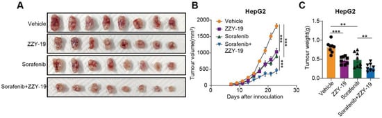 The combination of ZZY-19 with sorafenib synergistically suppresses the progression of HCC in vivo. (A) Representative images of tumors in nude mice. The mice were injected subcutaneously with HepG2 cells (n = 8). Seven days after injection, the mice were oral gavage with vehicle (Kolliphor® HS 15, i.g., once a day), sorafenib (30 mg/kg, i.g., once a day), ZZY-19 (30 mg/kg, i.p., once a day), or ZZY-19 plus sorafenib for 14 days. (B) Effects of the indicated treatments on tumor growth in HepG2 CDX mouse models. (C) Effects of the indicated treatments on tumor weight in HepG2 CDX mouse models. ** p < 0.01; *** p < 0.001.