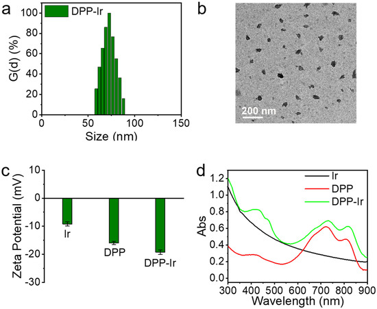 Figure 1. (a) Size distribution of DPP-Ir nanoparticles. (b) TEM image of DPP-Ir nanoparticles. (c) Zeta potential of indicated nanoparticles. (d) Absorption spectra of three nanoparticles in water.