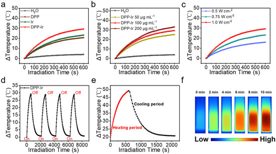 Figure 2. (a) Temperature elevation in three nanoparticles in equivalent concentrations (808 nm, 1.0 W cm−2). (b) Temperature elevation in DPP-Ir nanoparticles at different concentrations (808 nm, 1.0 W cm−2). (c) Temperature elevation in DPP-Ir nanoparticles under different power densities (100 μg mL−1, 808 nm). (d) Temperature change in DPP-Ir nanoparticles over four heating/cooling cycles (1.0 W cm−2). (e) Photothermal response of DPP-Ir nanoparticles in aqueous solution irradiated with 808 nm laser (100 μg mL−1, 1.0 W cm−2). (f) Infrared images of DPP-Ir after 808 nm laser (100 μg mL−1, 1.0 W cm−2) irradiation for 10 min.