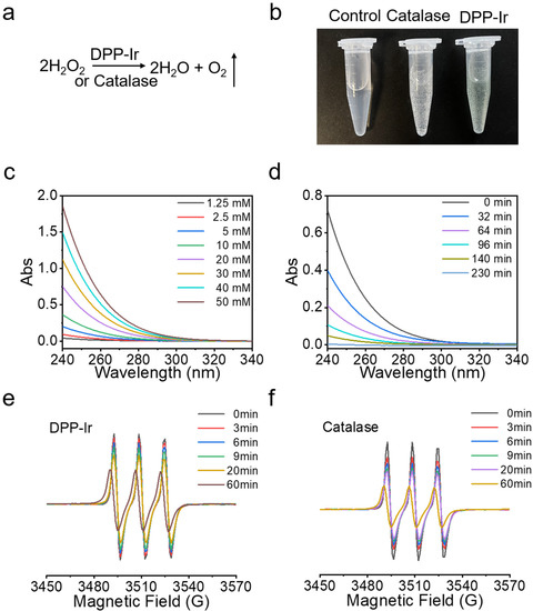 Figure 3. (a) H2O2 decomposition formula. (b) The images of gas bubbles produced after incubation of H2O2 with DPP-Ir/catalase in phosphate buffer (pH = 7.4) for 10 min, from left to right, are: control, 20 mM H2O2; catalase, 2 U mL−1 catalase + 20 mM H2O2; DPP-Ir, 50 μg mL−1 DPP-Ir + 20 mM H2O2. (c) Absorption curves for different concentrations of H2O2. (d) Time-dependent UV–vis spectra of H2O2 (20 mM) after the reaction with DPP-Ir nanoparticles (50 μg mL−1, pH 7.4). The EPR signals of time-dependent oxygen production catalyzed using DPP-Ir nanoparticles (50 μg mL−1) and catalase (2 U mL−1) at pH 7.4 are shown in (e,f), respectively.