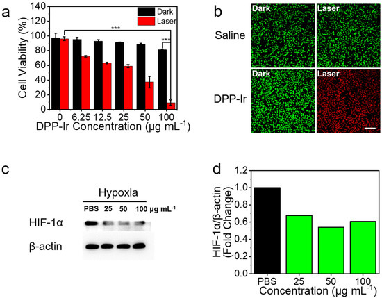Figure 4. (a) Viability of MDA-MB-231 cells treated with different concentrations of DPP-Ir nanoparticles with/without laser radiation (808 nm 1.0 W cm−2 10 min). (b) Fluorescence images of calcein-AM (green, live cells) and PI (red, dead cells)-co-stained MDA-MB-231 cells. (c) Western blot analysis of HIF-1α protein level in MDA-MB-231 cells’ incubation with DPP-Ir nanoparticles. (d) Gray value analysis of Western blot strips. *** p < 0.001.