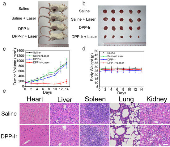 Figure 5. (a) Representative photographs of 4T1 tumor-bearing mice after different treatments. (b) Corresponding tumor images of each group after 14 days of treatment. (c) Time-dependent tumor growth curves (n = 5) observed after different treatments. (d) Body weight measurements of mice after various treatments. (e) H&E-stained slices of the heart, liver, spleen, lung, and kidney of healthy mice and mice treated with DPP-Ir nanoparticles. Scale bar: 50 μm.