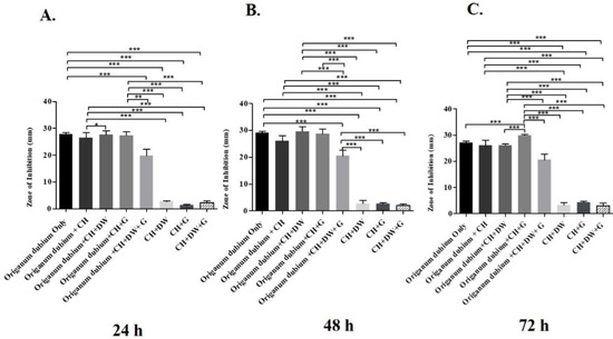 Inhibition zone diameters (mm) of different study groups containing the essential oil of O. dubium on E. faecalis. (A). Inhibition zone diameters (mm) measured 24 h post-incubation with various groups on E. faecalis. (B) Inhibition zone diameters (mm) measured 48 h post-incubation with various groups on E. faecalis. (C) Inhibition zone diameters (mm) measured 72 h post-incubation with various groups on E. faecalis (CH: calcium hydroxide; G: glycerin, DW: distilled water). Values represent mean zone of inhibition ± standard deviation (* p < 0.05, ** p < 0.01, *** p < 0.001).