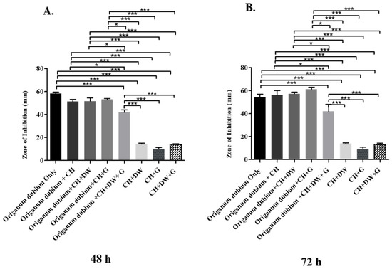 Inhibition zone diameters (mm) of different study groups containing the essential oil of O. dubium on C. albicans. (A) Inhibition zone diameters (mm) measured 48 h post-incubation with various groups on C. albicans. (B) Inhibition zone diameters (mm) measured 72 h post-incubation with various groups on C. albicans (CH: calcium hydroxide; G: glycerin, DW: distilled water). Values represent mean zone of inhibition ± standard deviation (* p < 0.05, *** p < 0.001).