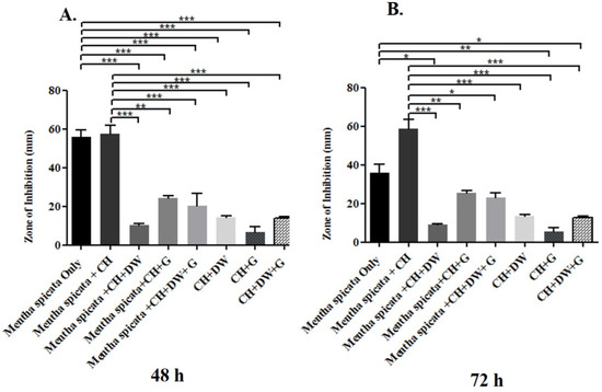 Inhibition zone diameters (mm) of different study groups containing the essential oil of M. spicata on C. albicans. (A) Inhibition zone diameters (mm) measured 48 h post-incubation with various groups on C. albicans. (B) Inhibition zone diameters (mm) measured 72 h post-incubation with various groups on C. albicans. (CH: calcium hydroxide; G: glycerin, DW: distilled water). Values represent mean zone of inhibition ± standard deviation (* p < 0.05, ** p < 0.01, *** p < 0.001).