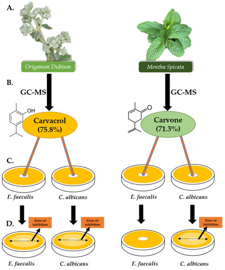 Graphical illustration of the study, with detailed compositions of the most abundant component of each essential oil. (A) O. dubium and M. spicata were collected, and their essential oils were extracted. (B) GC-MS analysis of both essential oils were participated. Carvacrol (75.8%) was found to be the most abundant component of O. dubium essential oil, whereas carvone (71.3%) was found to be the most abundant component of M. spicata. (C) Disk diffusion assay was carried out on 2 different microorganisms (E. faecalis and C. albicans). (D) The inhibition zones were measured for E. faecalis (24, 48, and 72 h) and for C. albicans (48 and 72 h).