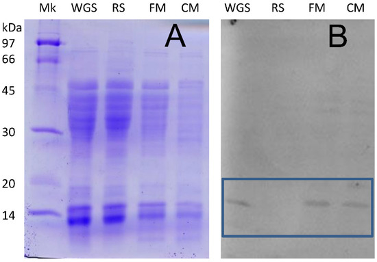 SDS-PAGE and Western blotting tracings for WGA extracts. The samples are identified as follows: markers (Mk); whole grain semolina (WGS); refined semolina (RS); fine millings (FM); coarse millings (CM). (A): Coomassie Blue staining; (B): Western blotting against commercial anti-WGA antibodies.