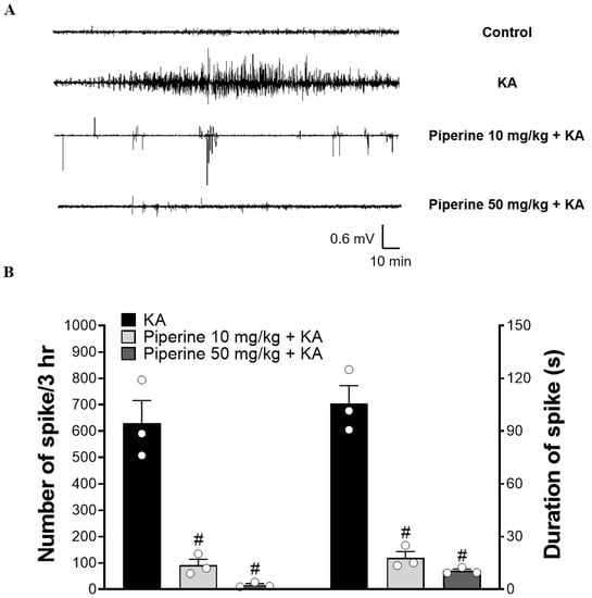 Effect of piperine pretreatment on electrographic seizures in rats with KA. (A) Representative EEG traces show epileptic bursts within 3 h. (B) The epileptic bursts are presented as the mean number and mean duration of seizure spikes. Data are presented as the means ± S.E.M. (n = 3). # p < 0.001 versus the KA group (ANOVA/Scheffé).