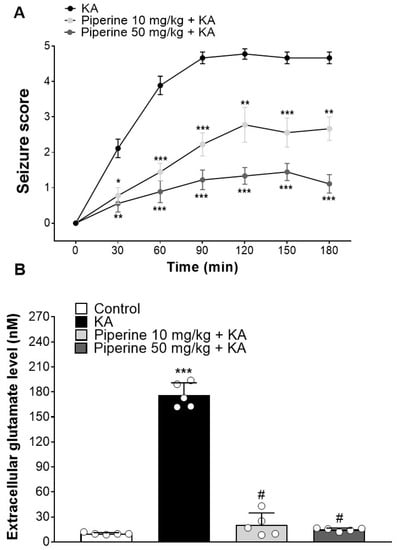 Effect of piperine pretreatment on seizure severity and extracellular glutamate levels in rats with KA. (A) Seizure scores are recorded every 30 min (n = 9). * p < 0.05; ** p < 0.01; *** p < 0.001 versus the KA group. (B) The extracellular glutamate levels from the cisterna magna were evaluated by HPLC (n = 5). Data are presented as the means ± S.E.M. # p < 0.001 versus the KA group; *** p < 0.001 versus the control group (ANOVA/Scheffé).