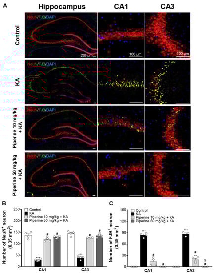 Three days after KA injection, brain tissue sections were stained with the neuronal marker neuronal nuclei (NeuN) and Fluoro-Jade B (FJB, identifying degenerating neurons) to study the neuroprotective effect of piperine on hippocampal neurons. As illustrated in Figure 4A, neuronal loss and neuronal degeneration were observed in the hippocampal CA1 and CA3 regions of the KA-injected rats, and piperine pretreatment (10 or 50 mg/kg) alleviated these KA-induced changes. The quantification showed that a significant reduction in the number of NeuN+ cells and a significant increase in the number of FJB+ cells were observed in the hippocampal CA1 and CA3 regions of the KA-injected rats (NeuN CA1: F(3, 12) = 119.4; NeuN CA3: F(3, 12) = 139.5; FJB CA1: F(3, 12) = 179.9; FJB CA3: F(3, 12) = 361.5, p < 0.0001 vs. the control group, Figure 4B). However, the number of NeuN+ cells in the hippocampal CA1 and CA3 regions was significantly increased in the piperine (10 and 50 mg/kg) + KA group compared with the KA group (CA1: p < 0.0001; CA3: p < 0.0001, Figure 4B). Similarly, the number of FJB+ cells in the hippocampal CA1 and CA3 regions was significantly reduced in the piperine (10 and 50 mg/kg) + KA group compared with the KA group (CA1: p < 0.0001; CA3: p < 0.0001, Figure 4C).