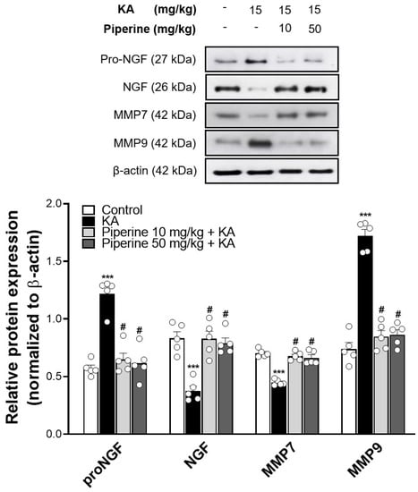 As NGF has a critical function in neuronal survival during brain injury induced by excitotoxicity [,], we assayed the expression of NGF and its precursor proNGF in the hippocampus of KA-treated rats. As depicted in Figure 5, KA significantly decreased the levels of NGF and significantly increased the proNGF levels compared with the control group (NGF: F(3, 16) = 17.5; proNGF: F(3, 16) = 31.6, p < 0.001). However, these alterations in NGF and proNGF expression were reversed by piperine pretreatment (p < 0.001). In addition, a significant decrease in the level of matrix metalloproteinase 7 (MMP7, a protease converting proNGF to NGF) and a marked increase in the level of matrix metalloproteinase 9 (MMP9, an NGF degrading enzyme) were observed in the hippocampus of KA-treated rats (MMP7: F(3, 16) = 43.5; MMP9: F(3, 16) = 80.7, p < 0.001 vs. the control group; Figure 5). Pretreatment with piperine (10 or 50 mg/kg) effectively restored the protein levels of MMP7 (p < 0.001) and MMP9 (p < 0.001) to the control levels in the hippocampus of the rats (Figure 5).
