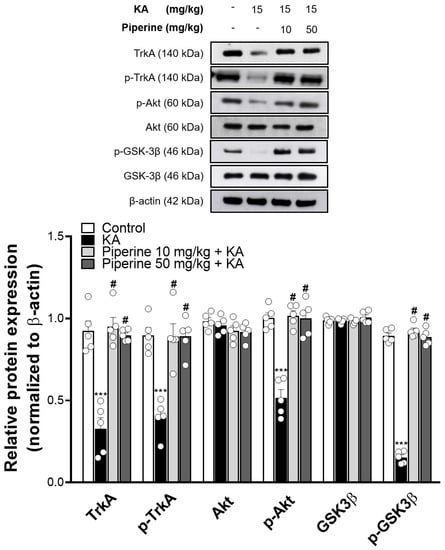 To further investigate the possible molecular mechanisms of piperine, we analysed the high-affinity membrane receptor tyrosine kinase A (TrkA) of NGF and its downstream Akt/GSK3β signalling pathway [,]. As shown in Figure 6, KA decreased the TrkA expression (TrkA: F(3, 16) = 31.39, p < 0.001 vs. the control group) and significantly reduced the phosphorylation levels of TrkA, Akt and GSK3β compared to the control group (pTrkA: F(3, 16) = 18.51; pAkt: F(3, 16) = 36.69; pGSK3β: F(3, 16) = 404.3, p < 0.001). These changes induced by KA were significantly increased in the piperine (10 and 50 mg/kg) + KA group compared with the KA group (p < 0.001).
