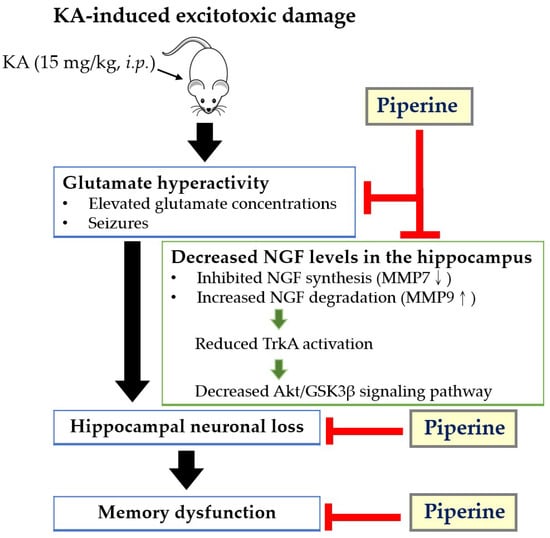 Schematic diagram representing the neuroprotective effects of piperine in the hippocampus of rats induced by KA. Piperine pretreatment ameliorates glutamate hyperactivity, upregulates NGF expression by increasing MMP7 levels and decreasing MMP9 levels, and enhances TrkA and Akt/GSK3β activation, which prevents KA-induced neuronal loss and maintains memory function. Arrows indicate KA-induced regulation, and T-bars indicate piperine-mediated inhibitory effects.