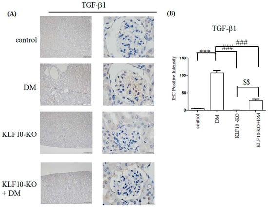 Figure 1. Decreased expression of TGF-β1 in KLF10 knockout (KLF10-KO) in diabetic (DM) mice. (A) Immunostaining or (B) RT-PCR analysis of kidney glomerular mesangium sections derived from control or KLF10-KO mice with or without diabetes (DM). The sections were subjected to immunostaining with TGF-β1 primary antibody. Left panel: magnification of 100×, right panel: magnification of 1000×. (B) Statistical analysis. Data are presented as means ± standard deviation from three different mice. ***: p < 0.001 compared with the control group. ###: p < 0.001 compared with the DM group. $$: p < 0.01 compared to KLF10-KO group. Scale bar: 200 μM at 100× and 20 μM at 1000×.
