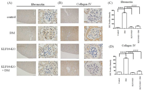 Figure 2. Knockout of KLF10 repressed fibronectin and type IV collagen expression in diabetic (DM) mice. Kidney glomerular mesangium sections derived from control or KLF10-KO mice with or without diabetes (DM) were subjected to immunostaining with fibronectin (A) and type IV collagen (B) primary antibody. Left panel: magnification of 100×, right panel: magnification of 1000×. (C) Fibronectin and (D) collagen IV; data are presented as means ± standard deviation from three different mice ***: p < 0.001 compared with the control group. ###: p < 0.001 compared with the DM group. Scale bar: 200 μM at 100× and 20 μM at 1000×.