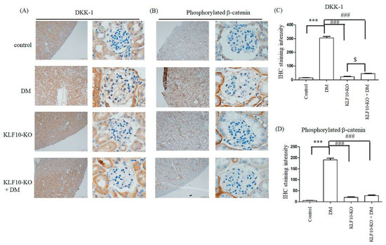 Figure 3. Knockout of KLF10 repressed DM-induced DKK-1 and phosphorylated β-catenin expression. Kidney glomerular mesangium sections derived from control or KLF10 knockout mice with or without diabetes (DM) were subjected to immunostaining with the (A) DKK-1 and (B) phosphorylated β-catenin primary antibody. Left panel: magnification of 100×, right panel: magnification of 1000×. (C) DKK-1 and (D) phosphorylated β-catenin; data are presented as means ± standard deviation from three different mice ***: p < 0.001 compared with the control group. ###: p < 0.001 compared with the DM group. $: p < 0.05 compared to KLF10-KO group. Scale bar: 200 μM at 100× and 20 μM at 1000×.