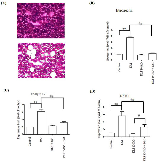 Quantitative RT-PCR was conducted to examine the regulatory effects of KLF10 on fibrosis-related gene expression. The gene expression of fibronectin, type IV collagen, and DKK-1 increased significantly to 3.76, 3.08, and 5.66 folds, respectively, in the DM group compared with the control group. No significant alternation of fibronectin and type IV collagen was found in the KLF10 knockout diabetes group compared with the KLF10 knockout alone. DKK-1 expression was significantly elevated in KLF10 knockout diabetes group compared with KLF10 knockout alone (p < 0.05). Moreover, the expression of fibronectin, type IV collagen, and DKK1 was significantly downregulated in KLF10 knockout DM compared with DM alone (Figure 4).