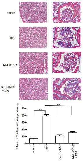 Furthermore, to test whether KLF10 involved in diabetes-induced renal fibrosis, we have performed Masson’s Trichrome staining and positive intensity was determined as previously reported [23]. As shown in Figure 5, Masson’s Trichrome staining intensity significantly increased in DM group compared to control group. The Masson’s Trichrome staining intensity was reduced to near control level in KLF10 knockout groups with or without DM.