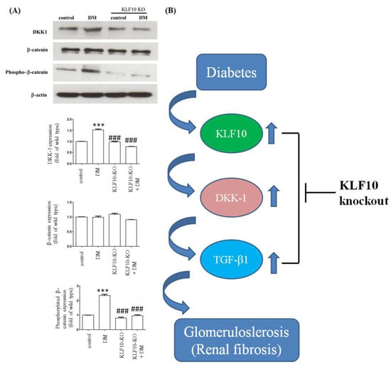 Figure 6. Knockout of KLF10 mitigated diabetes-induced DKK-1 and phosphorylated β-catenin expression. (A) Western blot analysis was conducted using proteins extracted from the kidney of control or KLF10 knockout mice with or without diabetes (DM). Data are presented as means ± standard deviation obtained from three different mice. ***: p < 0.001 compared with the control group. ###: p < 0.001 compared with the DM group. (B) KLF10 participated in renal fibrogenesis through the regulation of DKK-1 and its downstream pathway.