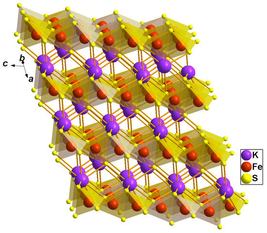 Ternary potassium-iron sulfide, KFeS2, belongs to the family of quasi-one-dimensional compounds with the general chemical composition AFeCh2 (where A–K or Rb; Ch–S or Se) [1,2]. These compounds share a common structural motif, i.e., a chain of edge-sharing chalcogen tetrahedra with iron ions inside (see Figure 1) [1,2,3]. Because of the strong intra-chain antiferromagnetic exchange interaction between the iron ions, these compounds are considered as model ones to study the magnetic properties and thermal behavior of a one-dimensional antiferromagnetic chain. KFeS2 is the most extensively investigated compound of this family. Nevertheless, so far, no consensus has been reached on the magnetic ground state of this compound, and the magnetic moment values presented in the literature are different from each other [4,5,6,7]. Several investigations argue that the spin state of the iron ions in this compound is low, S = 1/2 [4,5]. Therefore, in [6], it was noticed that the spin-1/2 one-dimensional Heisenberg model provides a good fit for the temperature dependence of the susceptibility of KFeS2. In contrast, based on the X-ray absorption spectroscopy study, the spin state was estimated as S = 5/2 [7]. Moreover, the magnetic moment of the iron ions in KFeS2 of about 1.9 μB obtained from neutron diffraction studies in [1] suggests that the intermediate spin state S = 3/2 is quite probable.