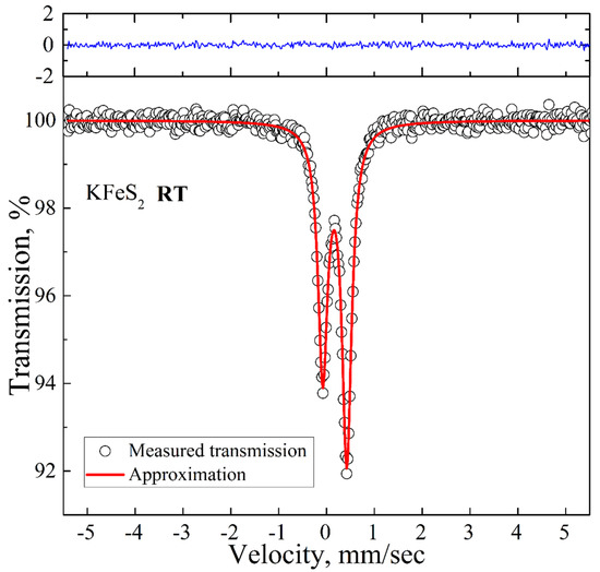 The room temperature spectrum is presented in Figure 3. It is an asymmetric doublet with the QS and IS values of 0.50 mm/s and 0.17 mm/s, respectively, which are in good agreement with the previously reported Mössbauer data for KFeS2 [26]. The asymmetry of the spectrum is a consequence of the quasi-one-dimensional structure of KFeS2 and the needle-like shape of the samples, which complicates the preparation of a fully isotropic powder sample. We did not detect any additional peaks above the background.