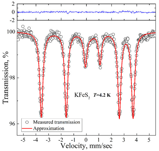 The low-temperature spectrum is presented in Figure 4. It is a magnetic sextet with the QS, IS, and HF values of 0.57 mm/s, 0.09 mm/s, and 225 kOe, respectively. The experimental spectrum is well described within a model with a single contribution of a magnetic sextet due to the long-range magnetic order already established in the compound at this temperature. The hyperfine field value of 225 kOe is in good agreement with the reported previous results on KFeS2 [27] (i.e., 237 kOe extrapolated to T = 0 K).