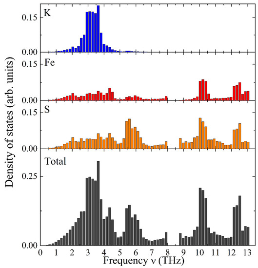 Figure 6 illustrates the calculated total and element-specific PDOS as a function of frequency for KFeS2. It exhibits a complex structure distributed over two distinct frequency ranges. The vibrational modes of potassium atoms have relatively low frequencies, thus dominating the frequency range of 1–5 THz (see Figure 6, the top bar chart in blue color). Iron atoms possess the highest vibrational frequencies and constitute a substantial part of the high-frequency range (9–13 THz, see Figure 6, the second bar chart from the top in red color). Sulfur atoms show vibrational modes in the whole frequency range under consideration (see the third bar chart from the top of Figure 6). The Debye-type PDOS of the K atoms manifests vibrations almost independently of the iron atoms in the chain, as expected for weakly bound K atoms.