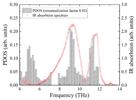 The experimental infrared absorption spectrum shows two broad lines, which are compared with the total PDOS in Figure 8. The best agreement for the resonant frequencies of the two experimental absorption peaks with the calculated ones was obtained for the frequency correction factor of 0.92. Notably, this is the same value that we obtained from the comparison of the iron PDOS with the NIS data.