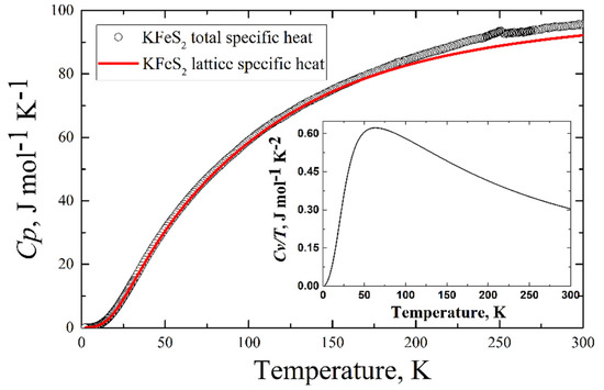 The experimentally measured total specific heat C(T) of the KFeS2 single crystal is presented in Figure 9 (see the legend). An anomaly is observed in the C(T) data at TN = 247 K. The phonon contribution to the heat capacity reaches a value of 95 J mol−1 K−1 at room temperature. This value does not exceed Dulong–Petit law’s limit (about 99 J mol−1 K−1).