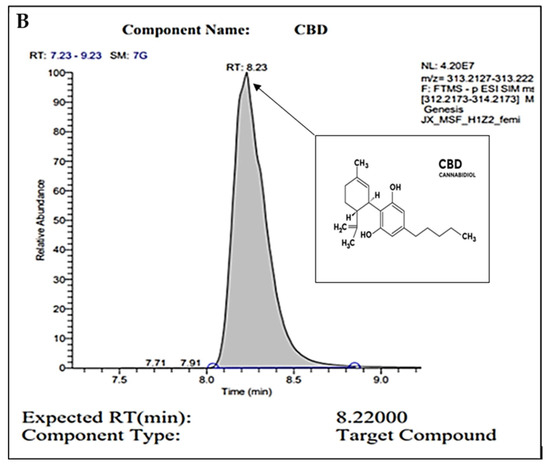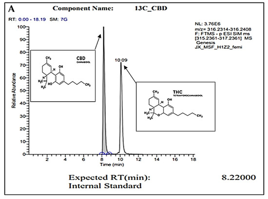 CBD extracts were analyzed by gas chromatograph (GC)/mass spectrometry (MS) using Agilent 6890N GC and Agilent 5975 MS (Agilent Technologies Inc., Santa Clara, CA, USA) with a Restek Rxi-5Sil MS with integra guard column (15 m, 0.250 mmID, 0.25 µm df) (Restek Corporation, Bellefonte, PA, USA). A solution of Restek Qualitative Retention Time Index Standard (Restek Corporation, Bellefonte, PA, USA) was used to create the retention time index. The temperature of the injection port was set at 280 °C and the helium gas flow was constant at 1.1 mL/min. The samples were injected in split mode (2:1) with a volume of 1 µL of sample. The GC oven temperature was programmed as follows: initial temperature of 70 °C for 4 min, ramp to 200 °C at 20 °C/min, ramp to 300 °C at 8 °C/min, ramp to 325 °C at 50 °C/min with a 5 min hold, thus requiring a total run time of 30.5 min. The MS transfer line was set to 250 °C, source to 230 °C, and quads to 150 °C. The raw data were processed and analyzed using Agilent Enhanced ChemStation software (Agilent Technologies Inc., Santa Clara, CA, USA). The NIST 2.0 library was used with AMDIS for compound identification.