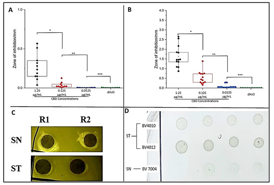 For further confirmation of antibacterial activity, spot assays were conducted using lag-phase S. typhimurium and S. newington cultures (OD > 1). Sterile agar plates were inoculated with four 10 μL aliquots of S. typhimurium or S. newington. Each ‘dot’ was then inoculated with 10 μL of one of the four dilutions (1.25, 0.125, 0.0125, or 0.00125 μg/mL) of CBD. Each culture was also spotted and treated with 10 μL of dH2O as the control. The plate was then incubated for 24 h at 37 °C and observed for inhibition of bacterial growth [59]. This assay was completed in triplicate.