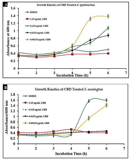 Treatment of lag-phase S. typhimurium (A) and S. newington (B) with CBD. The effect of several CBD dilutions on OD600 was recorded in triplicate.