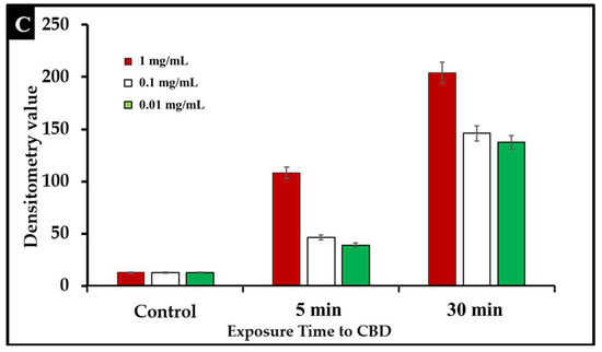 To examine the effect of CBD treatment on Salmonella cells, S. typhimurium and S. newington samples were treated with CBD at concentrations of 1.25, 0.125, or 0.0125 μg/mL. These samples were visualized using immunofluorescent 4′,6-diamidino-2-phenylindole (DAPI) staining. This staining technique emits fluorescence when the stain binds to AT-rich DNA. This stain is membrane impermeable, and thus, fluorescence represents compromised membrane integrity. DAPI staining confirmed that CBD treatment resulted in degradation of membrane integrity after 5 min and 30 min of treatment (Figure 4A,B). Quantitative analysis using densitometry of these images showed increased DAPI fluorescence from the 5 min to the 30 min time points (Figure 4C). These images all indicate that CBD can successfully damage Salmonella cells outer lipopolysaccharide membranes.