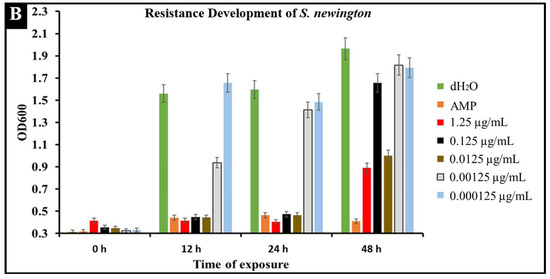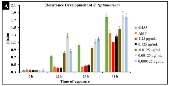 A major concern with conventional antibiotic treatments is the development of resistance. To observe the development of resistance in Salmonella against CBD treatment, extended kinetic studies were conducted over a span of 48 h. Salmonella strains S. typhimurium and S. newington were treated with ampicillin (MIC 0.5 µg/mL) or CBD (1.25, 0.125, 0.0125, or 0.00125 μg/mL). Results confirmed a developed resistance to CBD in both Salmonella species (Figure 6). At concentrations of 1.25 and 0.125 μg/mL of CBD, resistance development was not observed until the 48 h time point. These results suggest that CBD was effective in killing Salmonella and decreasing the rate of resistance development in both Salmonella strains over the initial 24 h time period. At 0.0125, 0.00125, and 0.000125 μg/mL concentrations of CBD, there was no significant reduction in bacterial growth and resistance was developed after only 12 h of exposure in both Salmonella strains. These results suggest that both Salmonella strains were able to develop resistance quickly to low concentrations of CBD.