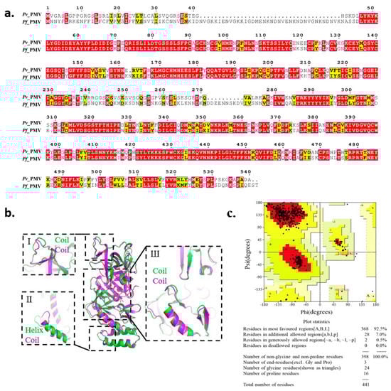 Homology modeling of PfPMV 3D structure. (a) Sequence comparison of plasmepsin V in Plasmodium vivax and Plasmodium falciparum. (b) Superposition of homology 3D structure of PfPMV (M09, in purple) and the crystal structure of PvPMV (PDB: 4ZL4, in green). (c) The Ramachandran plot of model M09.