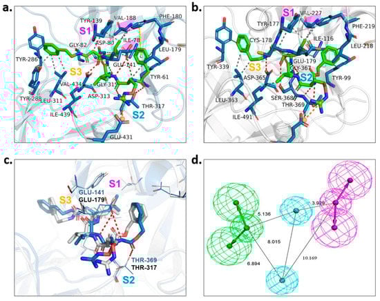 To gain the best hits, screening based on pharmacophore model analysis was performed simultaneously. According to the investigation of the substrate-binding sites of PvPMV in complex with WEHI-842 [17] (Figure 2a) and the structure-activity relationship of the PEXEL peptidomimetics [9,11], the -OH group which forms an H-bond interaction with Asp 80 and Asp 313 is important to the inhibition activity. The S1 pocket in PvPMV is composed of hydrophobic amino acid residues (Ile78, Val188 and Tyr139) [17], which require the binding of compounds with hydrophobic groups. The S2 binding cavity is lined by mostly hydrophobic amino acid residues (Ile439, Val434, Tyr286, Tyr288, Leu311 and Thr317) as well. Previous findings indicated that fully occupying the S2 subpocket could greatly increase the activity against PMV [9]. In addition, the guanidino group that forms the H-bond interaction with Glu141 and Gln183 in the S3 subpocket might also contribute to the inhibition [11]. The molecular docking of WEHI-842 to the homology 3D model M09 showed the active sites of PfPMV. Correspondingly, the S1 subpocket consisted of hydrophobic amino acid residues Val227, Tyr177 and Ile116; the S2 subpocket included residues ASP365, Thr369 and SER368 that could form an H-bond interaction with the active compound, and the S3 pocket was composed of Glu179 and Gly367 to form H-bond interactions (Figure 2c). However, minor differences were observed in the superposition of WEHI-842 interacting with both PvPMV and PfPMV models, where two amide groups formed H-bond interactions with the residue of Glu141 in the S2 subpocket and Thr369 in the S3 subpocket of PvPMV, respectively. This was not noticed in PfPMV, which might be due to the differences in residue side chains in these two proteins. Consequently, the pharmacophore model was constructed to possess two H-bond acceptors, two H-bond donors and two hydrophobic centers (Figure 2b). Virtual screening utilizing this model output 189 compounds.