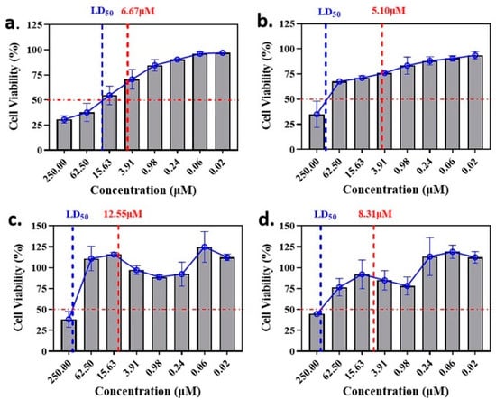 The murine fibroblast (L929) cell line was purchased from the National Biomedical Cell-line Resource Center (Beijing, China) and maintained in Dulbecco’s modified Eagle medium (DMEM, Thermo Fisher, Waltham, MA, USA) supplemented with 10% FBS (Gibco, Carlsbad, CA, USA) in a humidified atmosphere at 37 °C with 5% CO2. The cell viability of each compound was assessed via a CCK-8 kit (Beijing Solarbio Science & Technology Co., Ltd., Beijing, China) following the manufacturer’s instructions. Briefly, L929 cells were counted and dispersed into 96-well plates at 100 µL per well. After 48 h incubation, 10 µL of each compound at 2.75 mM was added and incubated for 24 h. Afterward, 10 µL of CCK-8 solution was added to each well and incubated for 4 h. A microplate reader (Infinite M200, Tecan Group Ltd., Männedorf, ZH, Switzerland) was employed to measure the absorbance of the cells at 450 nm.